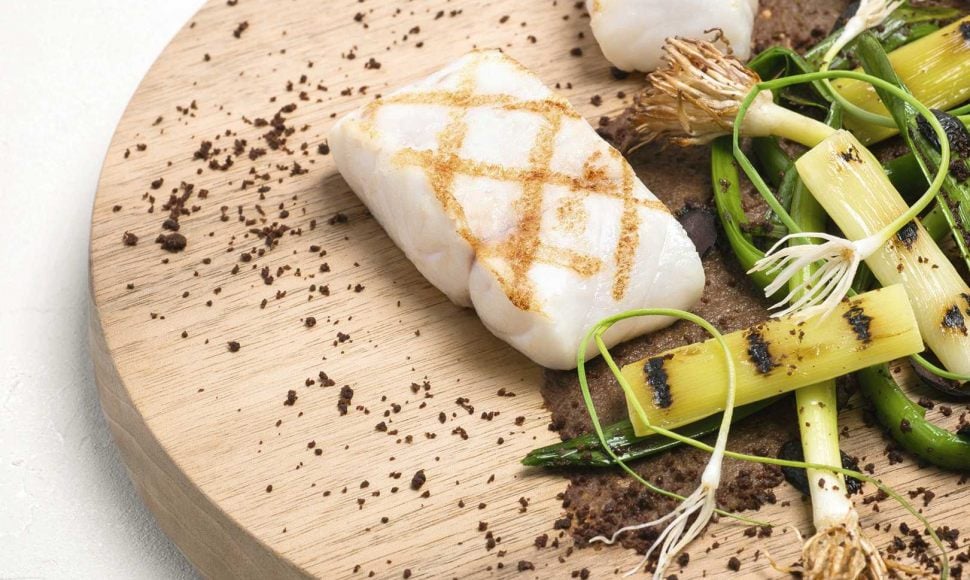 Bar de l’atlantique en ikejime, jeunes poireaux, olives noires
