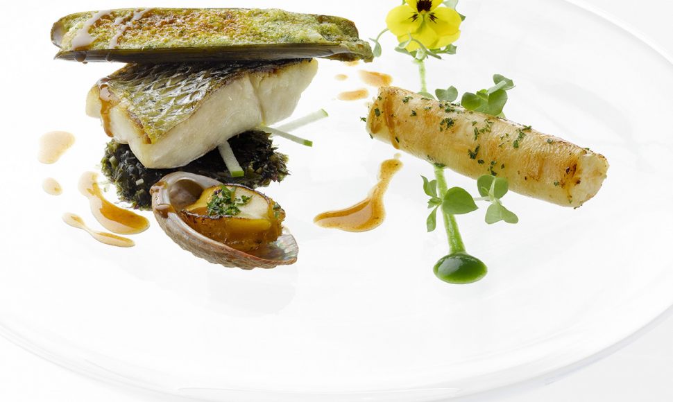 Bar de ligne rôti, couteaux gratinés et ormeaux juste poêlés, cannelloni végétal à l’huile de sésame, algues en condiments