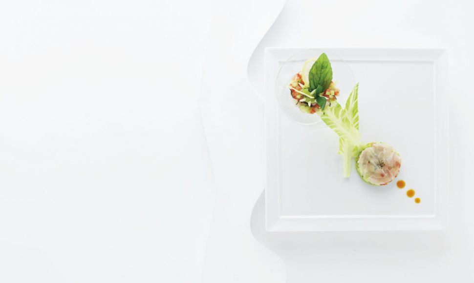 Bar mariné citron jaune/basilic, avocat lissé, amandes, romaine et concombre