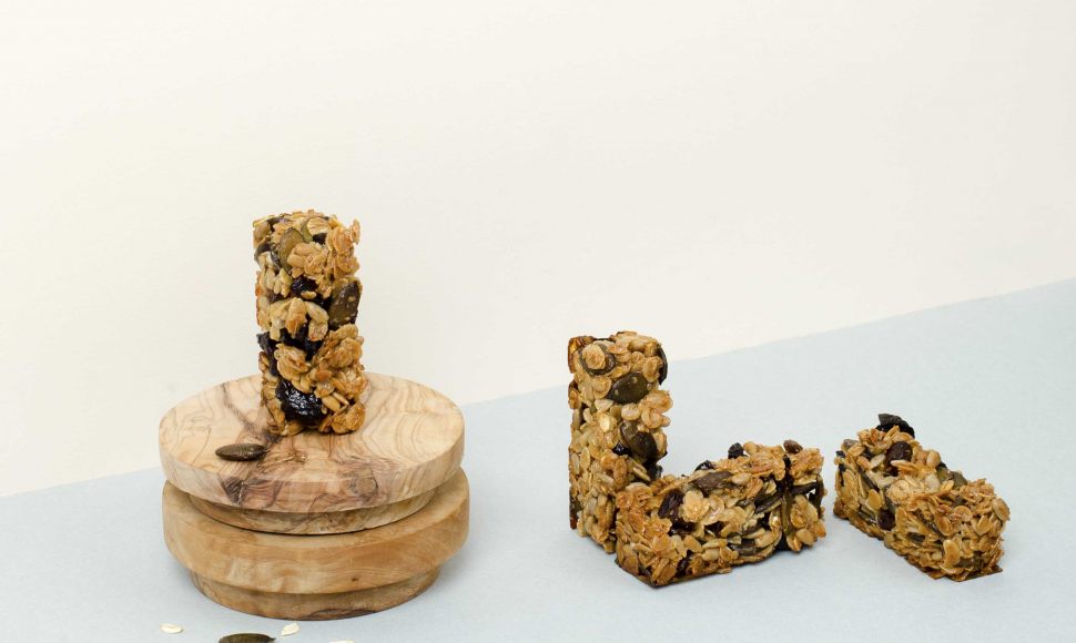Des barres de céréales fait-maison à partir d'huile d'olive, sirop d'érable et avoine, auxquelles sont ajoutés amandes, graines, abricots et raisins secs.