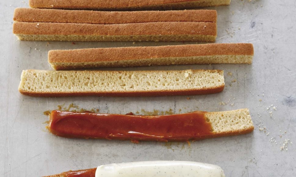Débarrassez la pâte obtenue sur une feuille de papier cuisson et abaissez-la à l’aide d’un rouleau à pâtisserie sur une épaisseur de 1 cm. Détaillez des barres de 1 x 15 cm sans les séparer, puis déposez-les sur une plaque de cuisson et faites-les cuire 12 min. Sortez-les du four et détachez les barres les unes des autres. Enfournez à nouveau pour 6 min. À la fin de la cuisson, laissez refroidir pendant 15 min puis placer au congélateur.