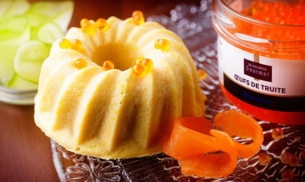 Servir les bavarois accompagnés d’œufs de truite, de lanières de truite fumée et de salade verte.