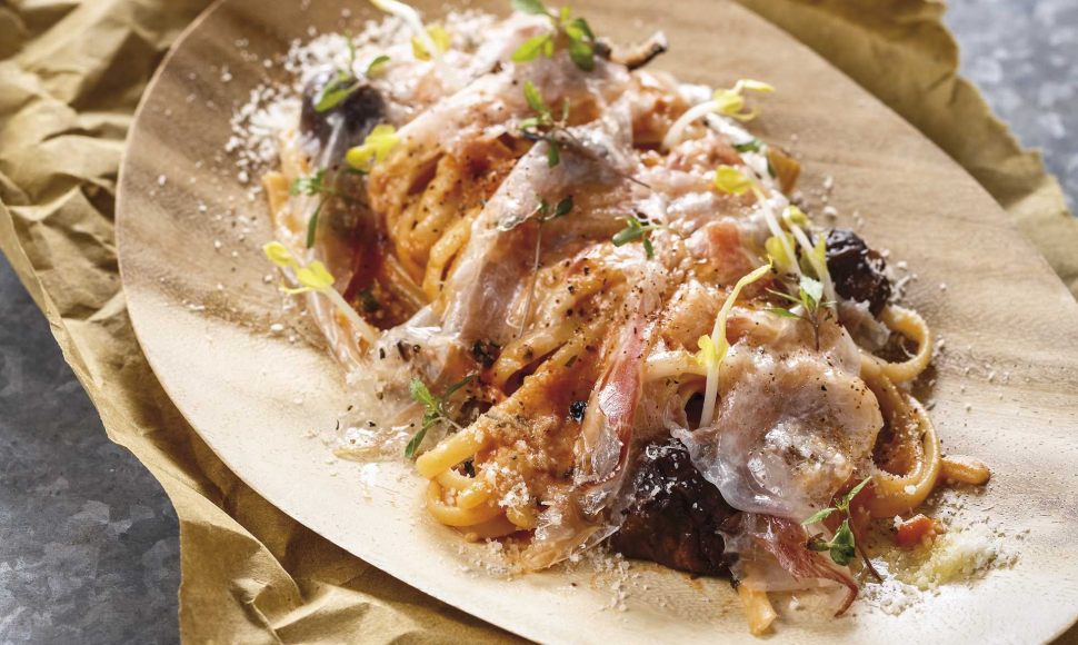 Des pâtes fraîches à la chair de saucisse et au lard de Colonnata et champignons accompagnées d'une sauce tomate maison.