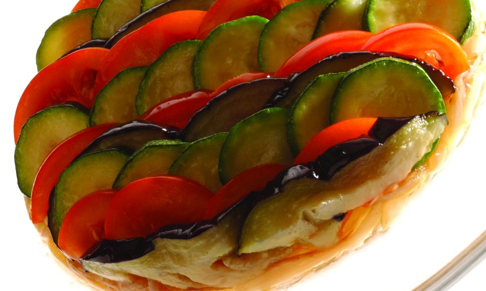 Laver et essuyer les aubergines et les courgettes. Couper les aubergines en deux dans leur hauteur. Tailler chaque moitié en tranches de 3 mm d’épaisseur environ. Détailler les courgettes en rondelles de la même épaisseur. Laver les tomates, retirer leur pédoncule. Les couper en deux. Tailler chaque moitié en tranches de 3 mm environ. Les réserver.