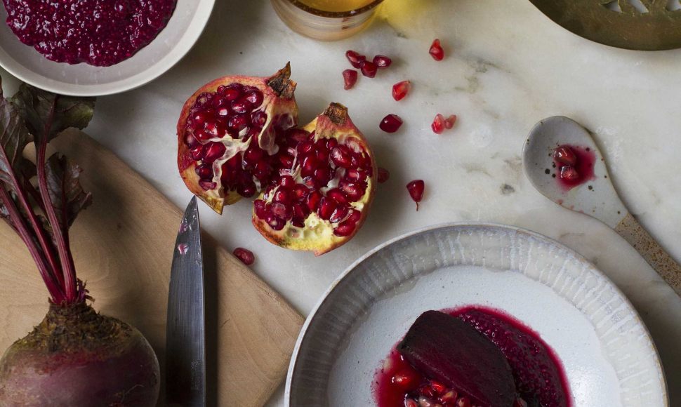Égrainez les grenades à l’aide d’une cuillère en prenant soin d’en réserver un tiers et les parures. Déposez ces dernières dans une cocotte. Nettoyez les betteraves, lustrez-les légèrement d’huile d’olive, puis posez-les sur les parures de grenade et les feuilles et épluchures de betterave.