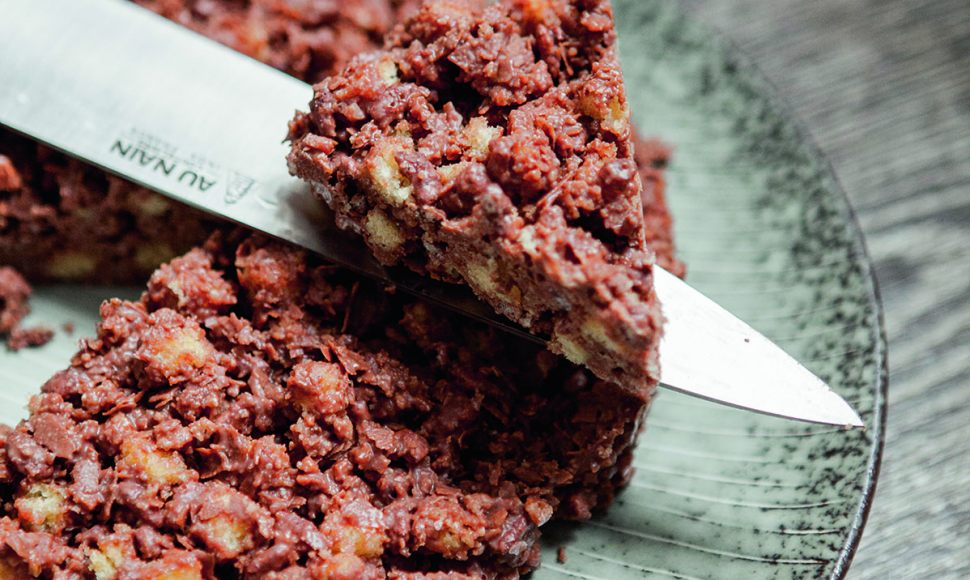 - Ôtez la croûte du cake, puis coupez-le en cubes. Émiettez les Gavottes® et les shortbreads.