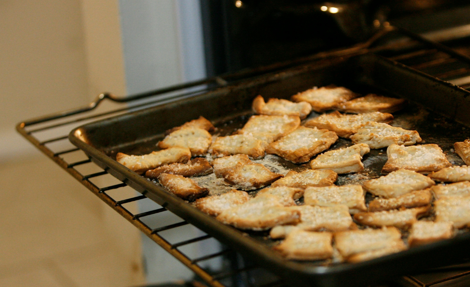 Réglez le four sur 180 °C (th. 6). Taillez la pâte en très fines tranches (de 2 mm d’épaisseur si possible) et disposez-les sur une plaque couverte de papier cuisson. Parsemez de fromage râpé. Cuisez pendant 10 à 15 min.