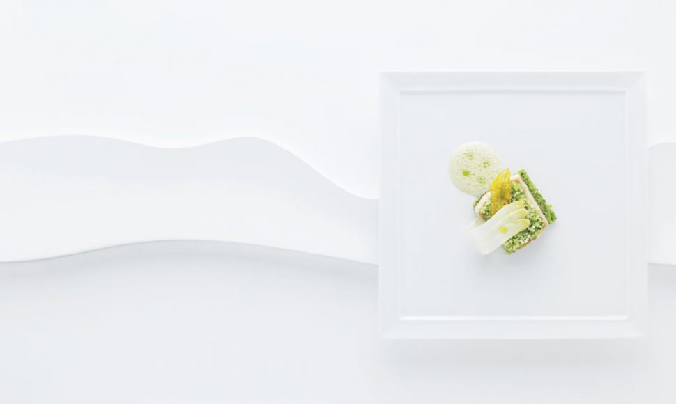 Blanc de bar cuit à plat marmelade d’asperges blanches et courgettes pilées à la coriandre
