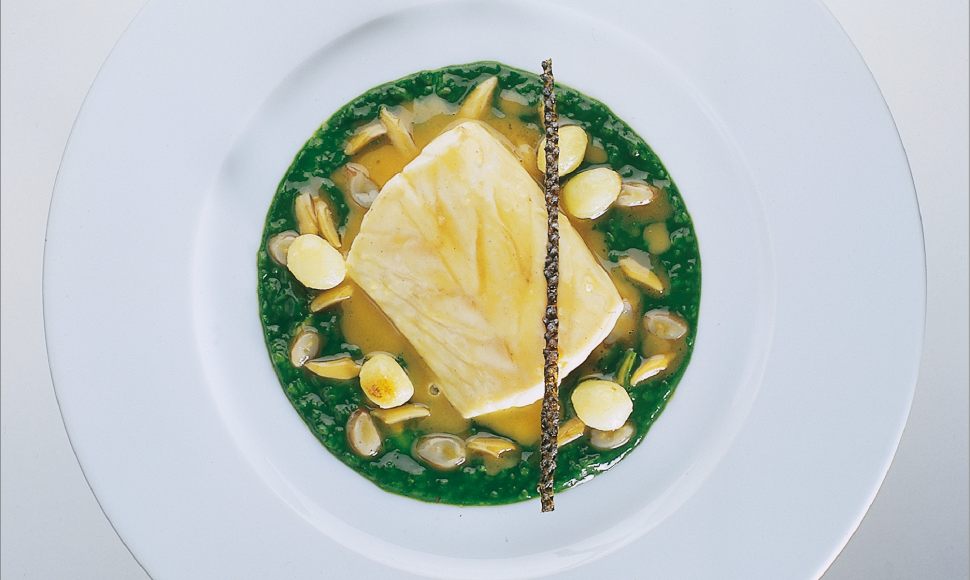 Blanc de bar cuit au four, condiment - garniture de coquillages au vert