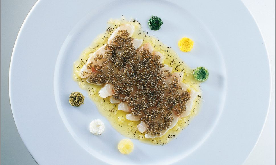 Blanc de bar en fines tranches marinées, citron – caviar osciètre