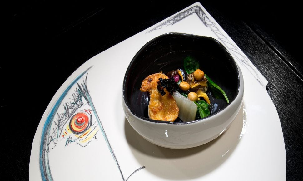 Tailler les carottes, la mangue et le chocolat en dés les faire revenir dans une cocotte avec un filet d’huile d’olive, ajouter le poivre de Sichuan et mouiller avec le vin rouge, laisser cuire afin d’obtenir une consistance sirupeuse. Passer au chinois étamine en pressant au maximum la pulpe puis réserver. Réaliser une purée de cèpes, mettre en poche à douille. Sur plaque, étaler les chanterelles, les trompettes de la mort, une branche de thym, une branche de romarin et l’ail écrasé. Faire cuire sous la salamandre jusqu’à les rendre croustillantes.