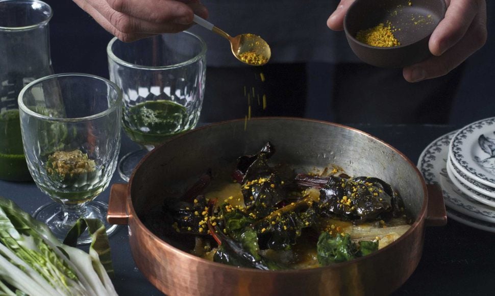 Des blettes gratinées au miel pour une association sucrée-salée, agrémentées de pollen frais, et accompagnées d'une boisson fraîche et herbacée citron-vert et de blette.