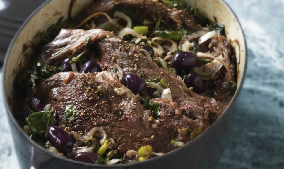 Dans le fond d’une grande cocotte, montez en couches successives les aromates et la viande égouttée, glissez quelques feuilles de laurier çà et là. Arrosez de vinaigre puis de marinade. Versez un peu d’eau pour que le liquide affleure. Ajoutez les olives dénoyautées.