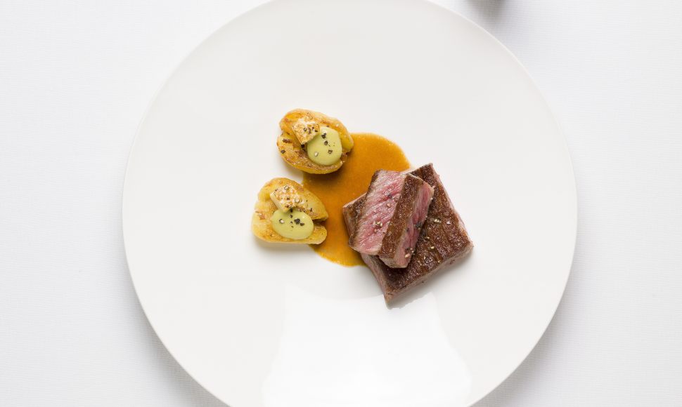 Boeuf wagyu « Gunma » Grade 4 ferré au sautoir, pommes de mer de Noirmoutier tapées au lait frit, condiment iodé