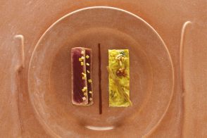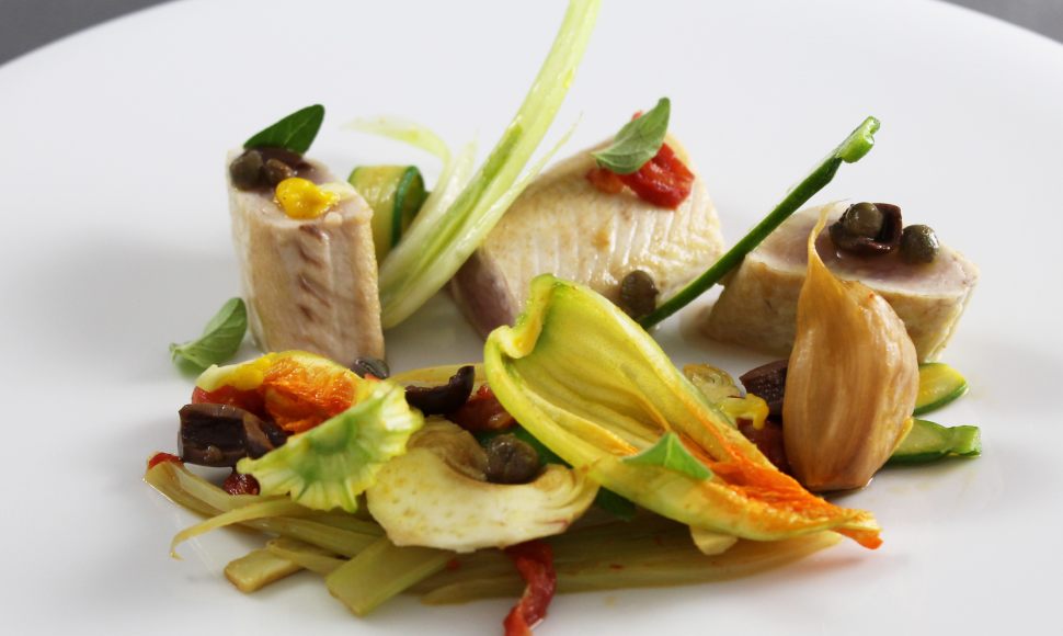 La bonite, poisson cousin du thon, se distingue par sa chair fine et délicate. Elle est ici cuite en toute sa simplicité, juste saisie à l'huile d'olive, et accompagnée d'une farandole de légumes et de condiments parfumés à l'ail confit. Une entrée tout en légèreté.