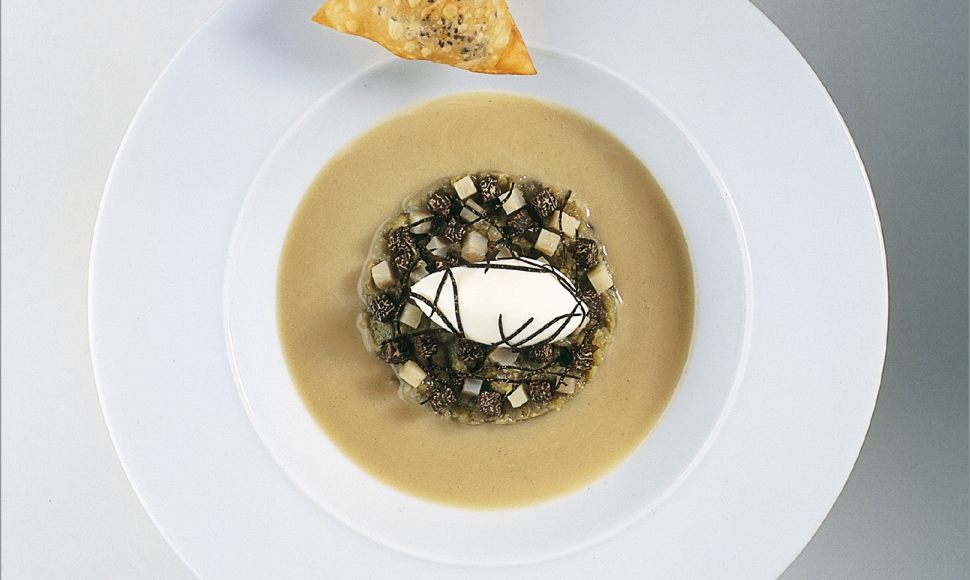 Bouillon d’artichaut et cèpe, rissoles de foie gras et matignon aux truffes
