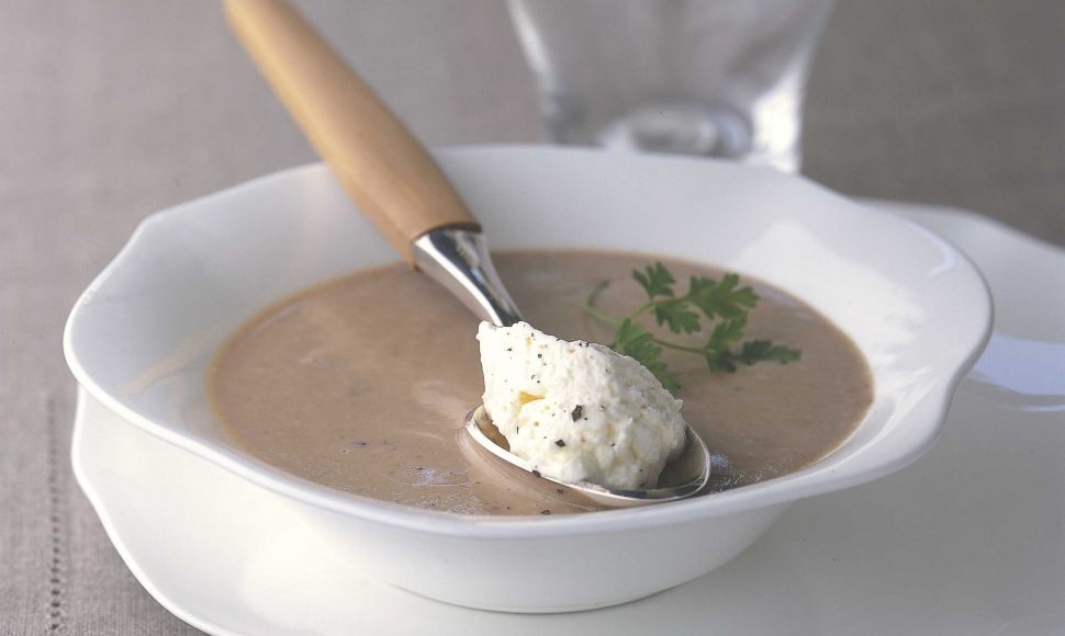 Versez le bouillon chaud de châtaignes dans des assiettes creuses et posez dessus un peu de crème fouettée à l’aide d’une cuillère à soupe.