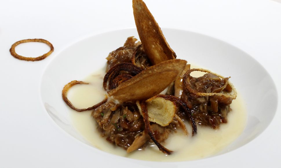 Préchauffer le four à 160°C. Retirer le cœur et les poumons des avants de lapin. Sectionner la tête. Avec une paire de ciseaux, séparer les avants le long de la colonne vertébrale. Retirer la palette qui se trouve à l’extérieur des épaules. Assaisonner les avants. Éplucher et émincer finement les oignons. Chauffer un filet d’huile d’olive dans une cocotte. Y faire dorer les avants de lapin de tous côtés. Les décanter sur une grille. Ajouter les oignons et le romarin et la gousse d’ail claquée et mélanger. Laisser compoter pendant 5 minutes.