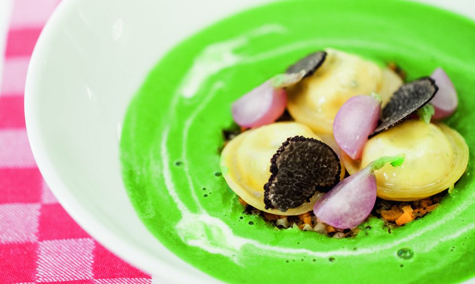 Bouillon de laitue, ravioles de fromage de campagne à la truffe noire