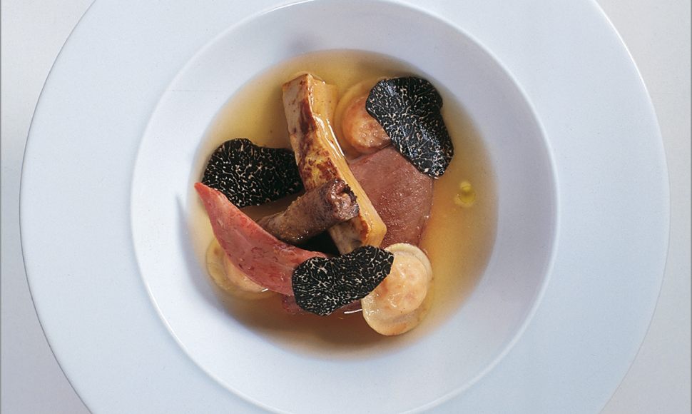 Bouillon de poularde, râpée de truffe noire, une garniture de ravioles de potiron, poitrine de pigeonneau pochée, les cuisses farcies et foie gras