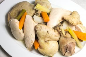Déposez une poule entière dans une grande casserole ou un faitout. Recouvrez-la d’eau et ajoutez une poignée de gros sel de mer. Laissez bouillir et écumez. Ajoutez la garniture aromatique. Continuez la cuisson à petits frémissements pendant 1 h 30 et laissez reposer. Passez le bouillon sans fouler et réservez au frais. Le lendemain, à l’aide d’une cuillère, retirez la couche de gras qui s’est formée sur le bouillon.