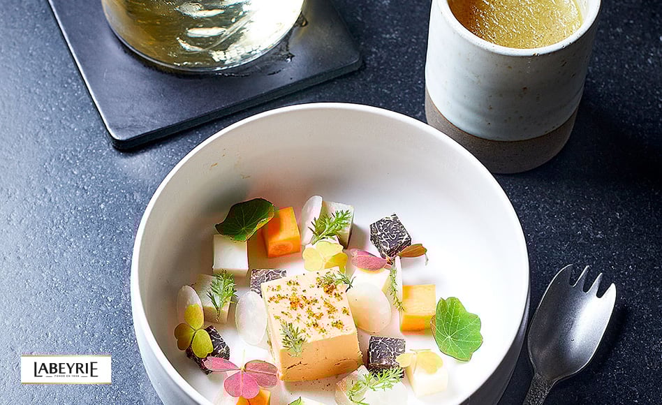 Dans un bol (ou une assiette creuse), déposez de gros cubes de foie gras et quelques légumes du bouillon de volaille. Versez le bouillon encore chaud directement dans le bol pour faire fondre délicatement le foie gras.