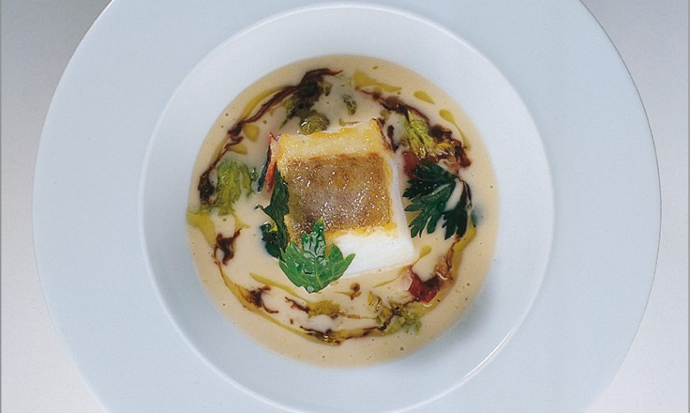 Bouillon froid de haricots blancs du val nervia, épaisse morue de bilbao servie tiède et feuilles de livèche, persil et céleri frits