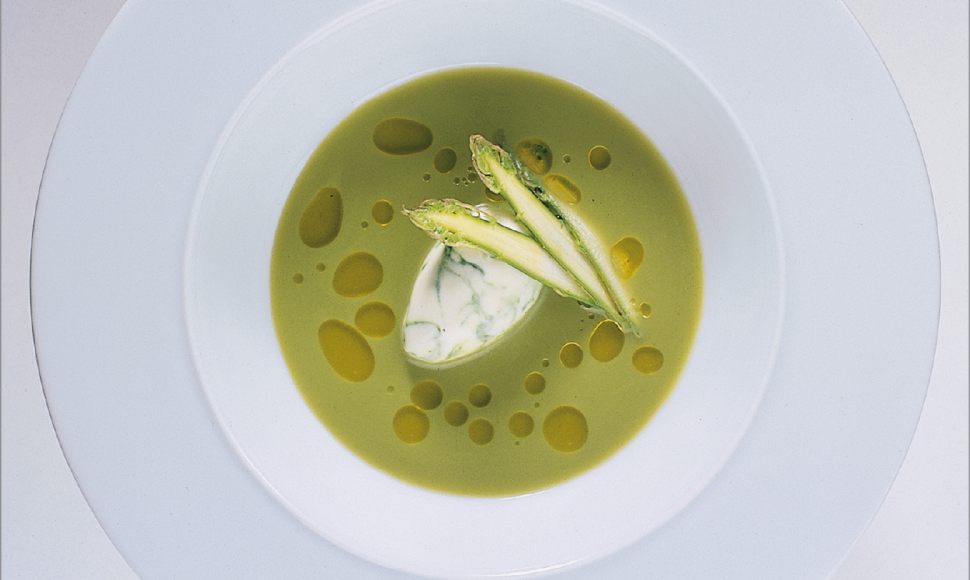 Bouillon glacé d’asperge verte en cappuccino vert et blanc