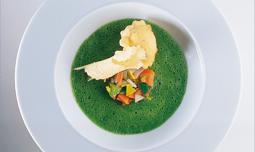 Bouillon léger d’herbes et de salades amères, paysanne de légumes au jus de jambon, œufs de caille en fine pâte et dentelles de vieux parmesan