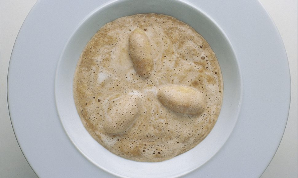 Bouillon léger de lentille verte en cappuccino, quelques gnocchi au lait caillé