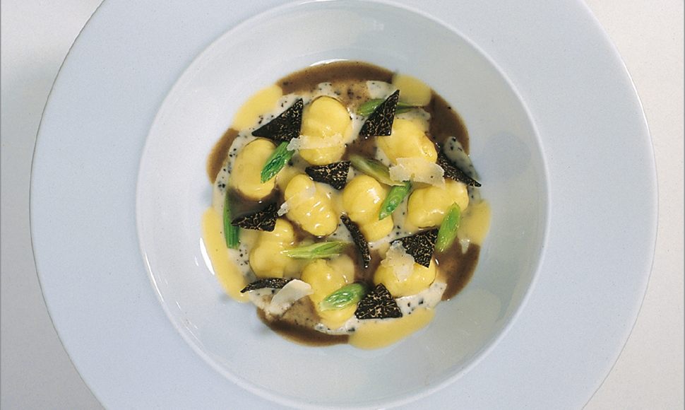 Bouillon parmentier aux truffes garni de poireaux et gnocchi de pomme de terre fondants