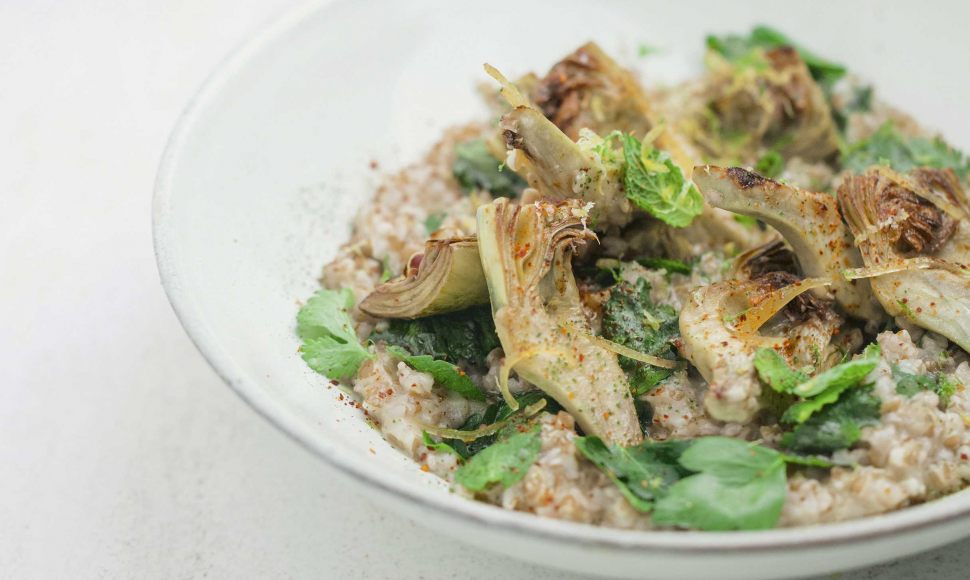 Une recette de boulgour aux artichauts et riquette, assaisonné de coriandre et piment d'Espelette.