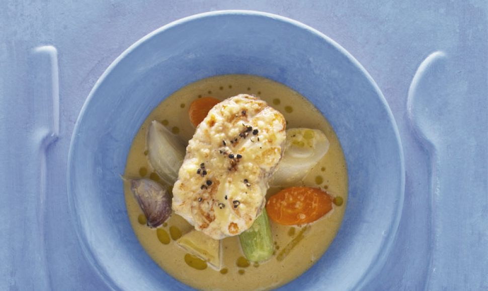 Nettoyer le poisson. Couper la tête. Lever les deux filets. Réserver l’arête centrale. Supprimer toutes les peaux sur la chair de la baudroie. Couper chaque filet en deux tronçons.