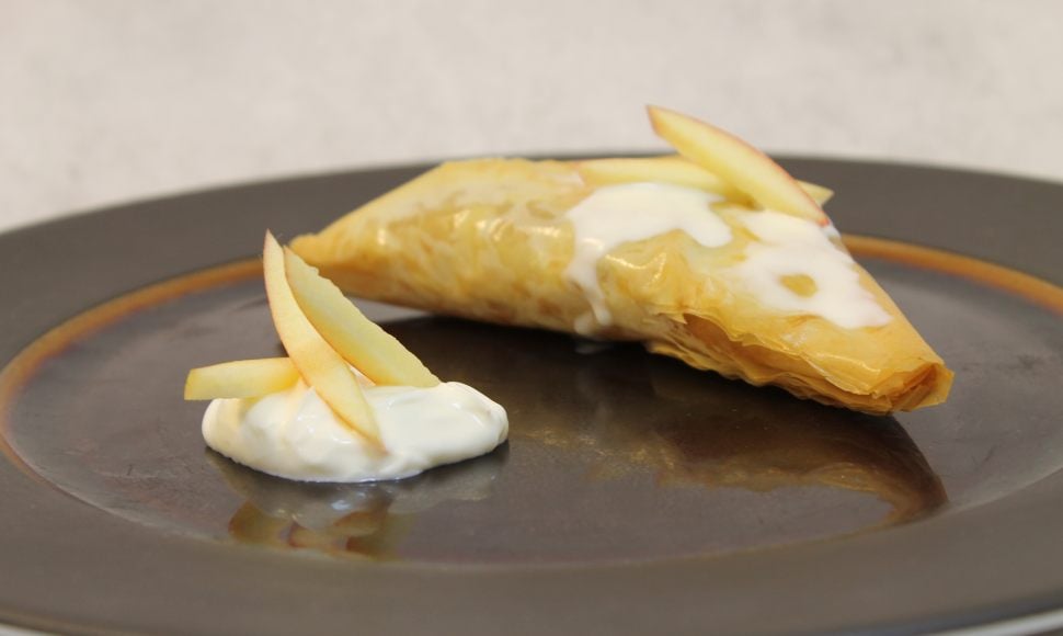 Étaler une feuille de pâte filo la plier en deux. Avec un pinceau, la badigeonner d’une goutte d’huile d’olive. Au milieu de cette bande, déposer deux c. à s. de pommes / raisins à 3 cm du bord gauche et du bord inférieur. Replier le coin gauche vers le bord inférieur de la bande de façon à obtenir un triangle. Replier ce triangle sur toute la longueur de la bande et rabattre le dernier morceau de pâte pour fermer le triangle. Toujours au pinceau, huiler les deux faces du triangle. Répéter l’opération avec les trois autres feuilles de filo. Les réserver.