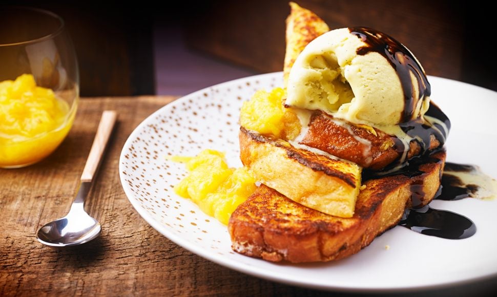 Préparer le pain perdu et mélanger tous les ingrédients ensemble. Bien imbiber les tranches de gâche. Faire chauffer une noisette de beurre dans une poêle et cuire les tranches de pain des 2 côtés. Servir le pain perdu avec la concassé de tomate, la glace à l’huile d’olive et le vinaigre balsamique réduit.