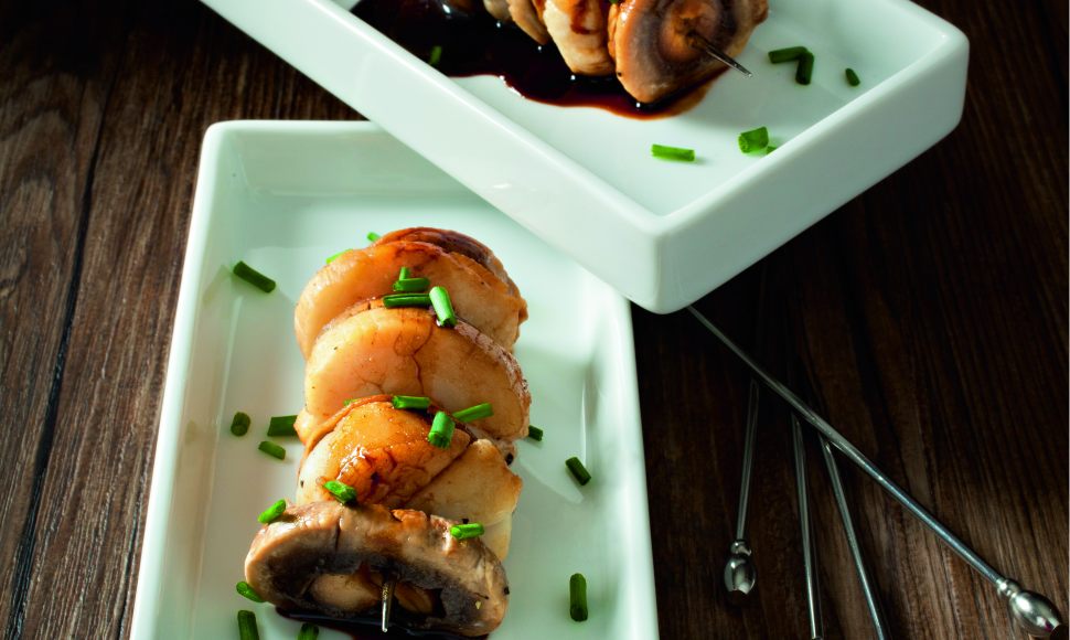Coupez le pied des champignons et ne gardez que les chapeaux. Passez-les rapidement sous l’eau froide puis essuyez-les bien. Coupez chaque chapeau et chaque noix de Saint-Jacques en deux. Enfilez les noix de Saint-Jacques et les champignons sur quatre brochettes.