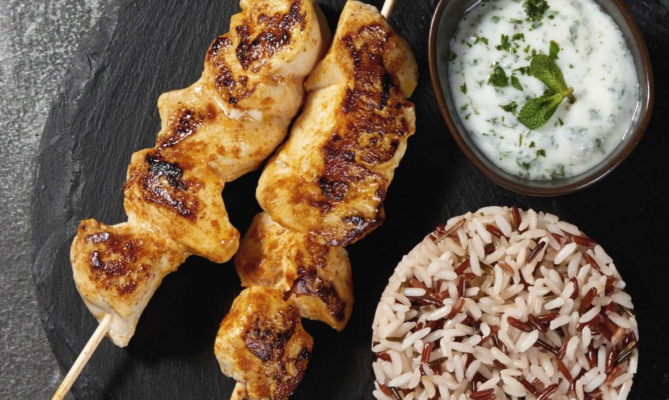 De délicieuses brochettes de blancs de poulet parfumées au tandoori, que l'on sert avec une sauce onctueuse au yaourt, à la coriandre et à la menthe.
