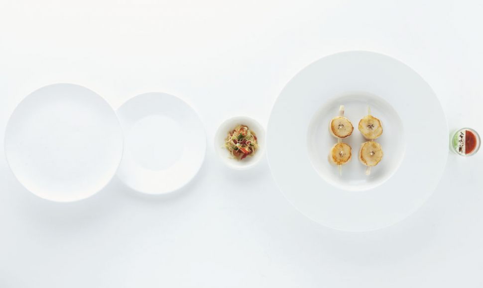Ranger les Saint-Jacques par deux, dans le même sens. Enfiler deux tiges de citronnelle en changeant légèrement l’angle d’entrée et de sortie de façon à avoir une brochette très stable.