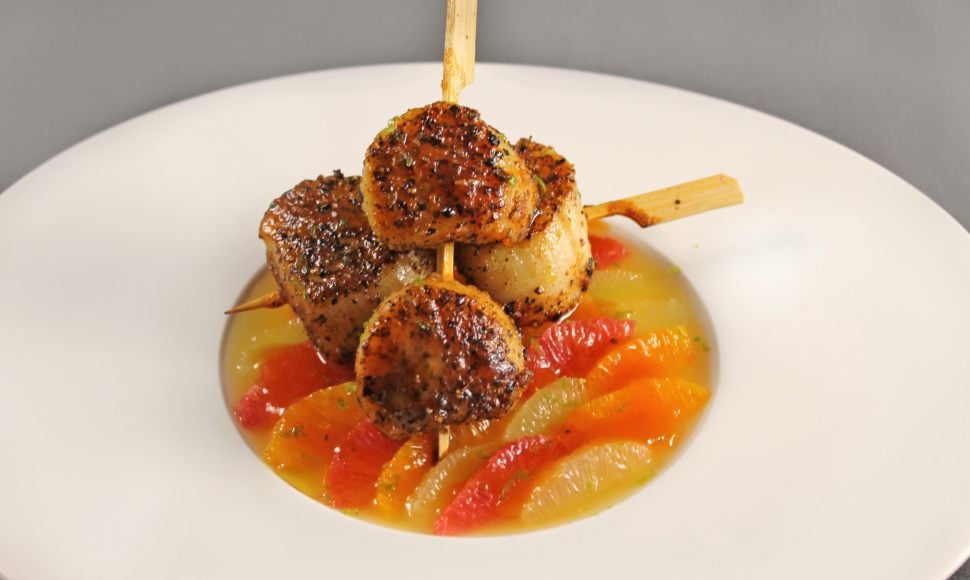 Cette entrée qui mêle fraîcheur, acidité et saveur iodée fera son plus bel effet à l'heure d'entamer son repas de fin d'année. Des brochettes de noix de Saint-Jacques panées d'un mélange de zestes d'agrumes et de poivre mignonnette viennent s’asseoir sur un aspic d'agrumes. Simple et délicat.
