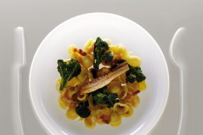 A l’origine, des « Broccoli in padella », recette classique du Latium dans laquelle les légumes sont préparés croquants, « al dente » comme les pâtes. Nous les avons mariés avec quelques asperges et relevé d’un énergique lard paysan.