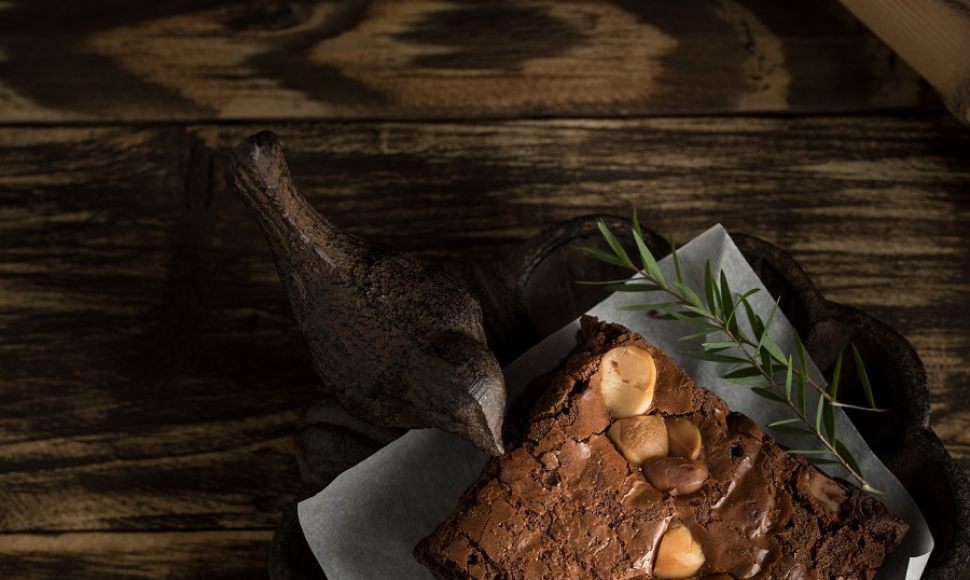 Une délicieuse recette de brownie aux noix de macadamia (pour 1 brownie de 15 x 15 cm).
