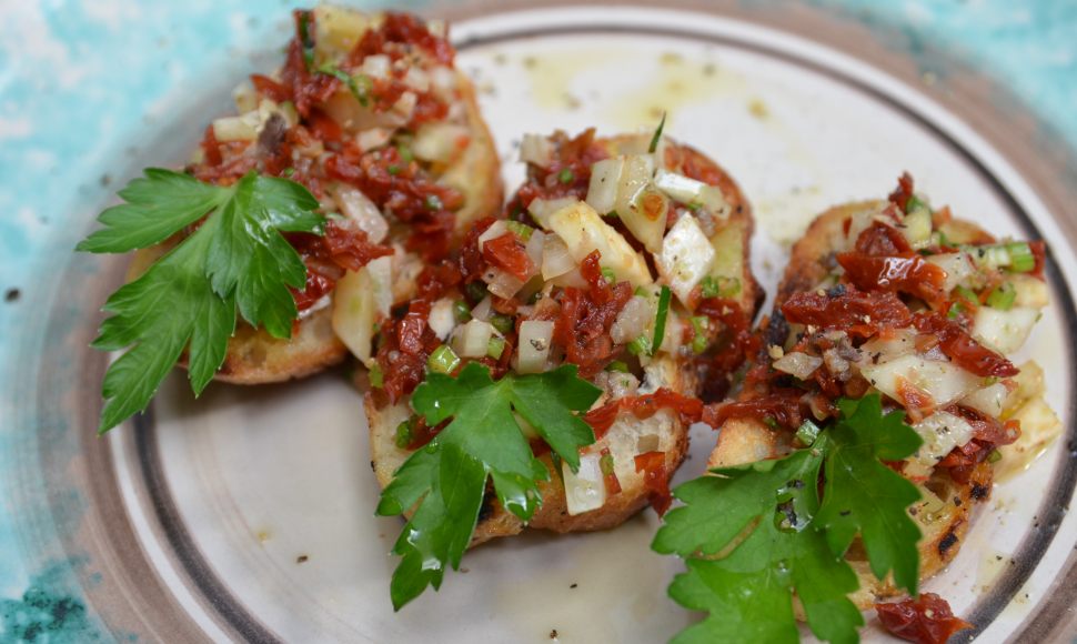 Faire griller au four ou dans un poêle 12 tranches de pain (soit tradition, soit pain maison) arrosées d’un filet d’huile d’olive. Une fois les tranches de pain sorties du four, disposer la préparation dessus et servir.