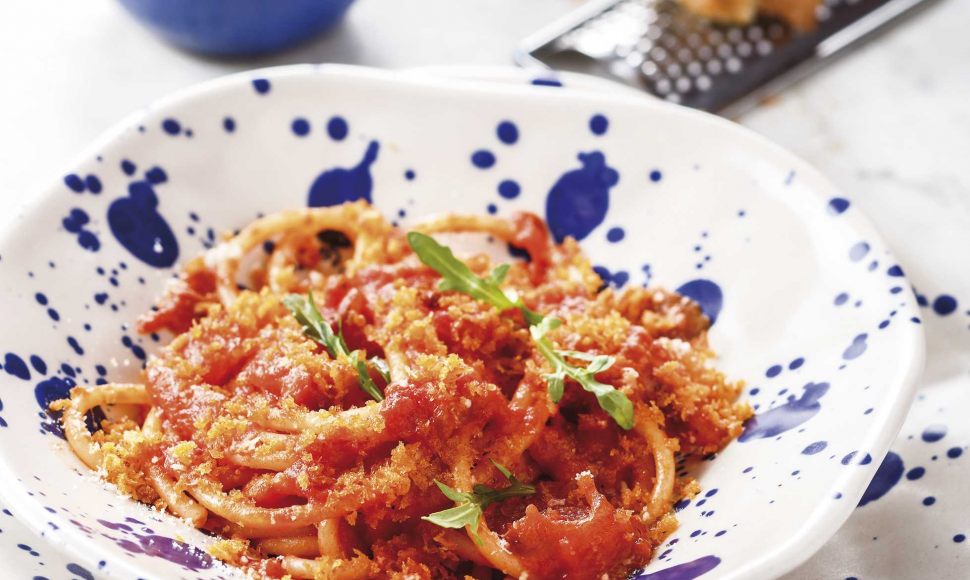 Des pâtes bucatini à la sauce tomate maison et aux oignons, guanciale et pecorino romano.
