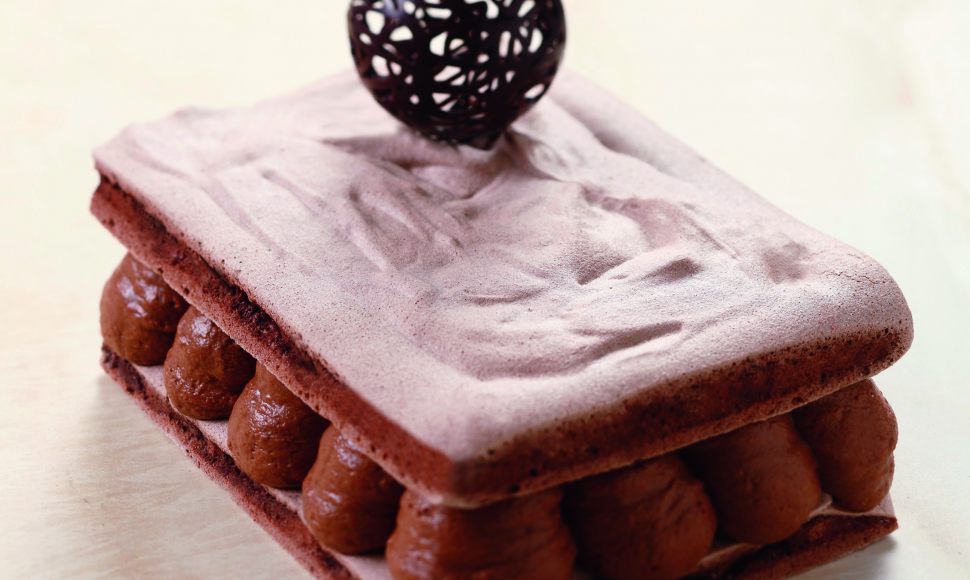 Mettez dans une poche munie d’une douille unie n° 6 et dressez 2 rectangles de 12 x 16 cm sur du papier cuisson et enfournez pour 2 h.