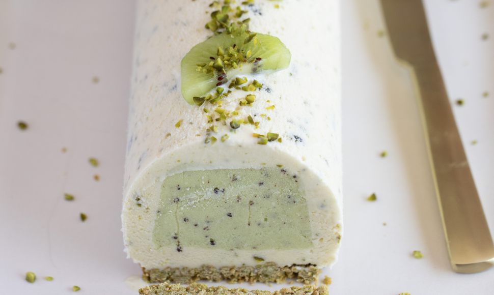 Une bûche glacée de saison qui associe le chocolat blanc au kiwi et aux pistaches ; le combo gagnant. Le conseil : il est inutile de sortir la bûche avant dégustation, elle a la bonne consistance dès la sortie du congélateur.