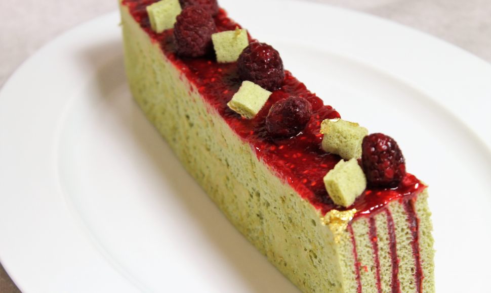 Étaler la marmelade sur le biscuit roulé au thé matcha. Tailler des bandes de 6 cm puis les superposer. Basculer la bûche sur la tranche puis la badigeonner de marmelade de framboise. Décorer avec quelques framboises. Réserver au frais.