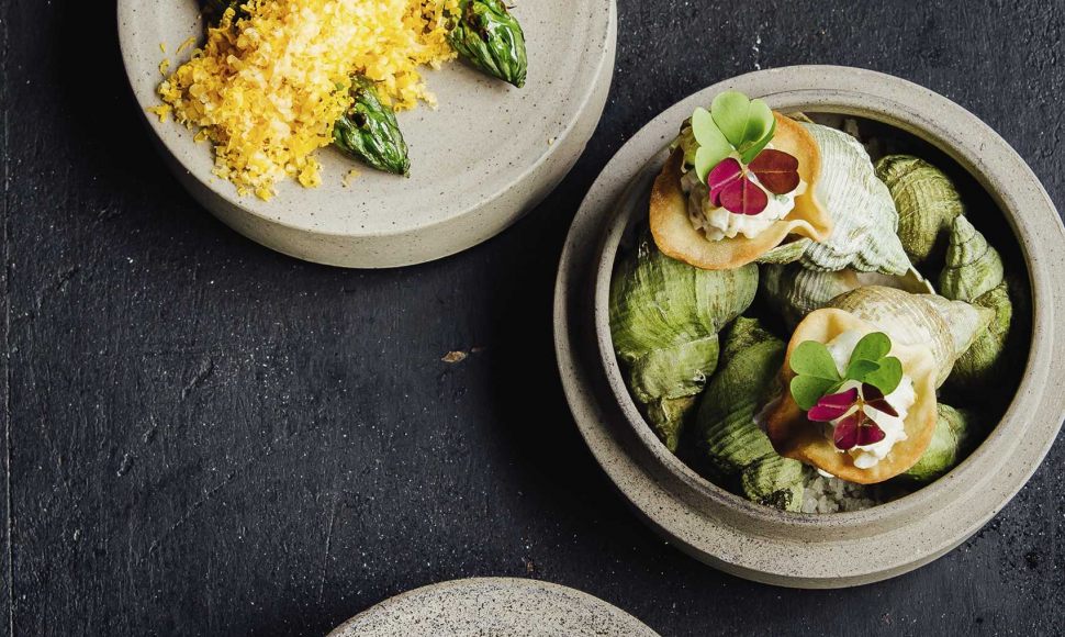Après le temps de repos, abaissez finement la pâte à l’aide d’une machine à pâtes ou d’un rouleau à pâtisserie. Badigeonnez-la d’huile d’olive à l’aide d’un pinceau, puis détaillez 40 crackers à l’aide d’emporte-pièces ronds de 50 mm de diamètre. Formez des boules de papier d’aluminium de la taille de billes et recouvrez-les des cercles de pâte : ces ramequins de pâte, une fois cuits, accueilleront la salade de bulots. Déposez les billes sur une plaque et enfournez pour 10 min environ, en les surveillant et en les retournant tout au long de la cuisson.