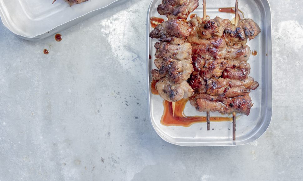 Épongez la viande avec un essuie-tout, puis coupez-la en lamelles. Plongez-la dans la marinade et laissez-la 30 min au moins. Répartissez-la sur 4 piques à brochettes, puis faites cuire ces dernières à la poêle avec de l’huile ou au barbecue.