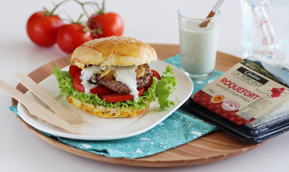 Couper les buns en deux puis les garnir de salade, de rondelles de tomate, de steaks hachés et d'oignons. Napper de sauce au roquefort et déguster sans attendre.