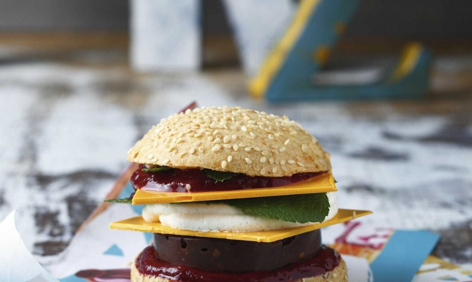 Un trompe l'oeil sucré du célèbre hamburger : pâte à choux pour le pain, cheddar en chocolat, palet en chocolat pour la viande, confit de fraise et ganache montée vanille pour les sauces.
